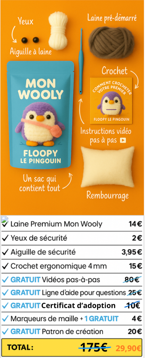 Chaque kit contient la laine, le crochet, le rembourrage, l’aiguille, les yeux de sécurité, et bien sûr, un accès au tutoriel vidéo complet. Tu n’as rien besoin d’acheter en plus — il ne te faut que ton sourire et un peu de patience.